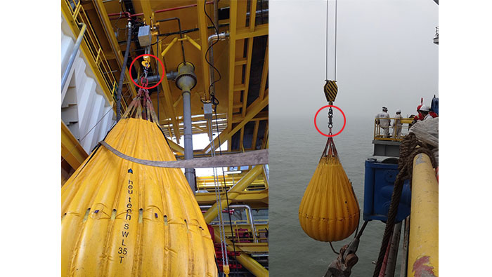 在此測試項目進行時,用戶需要對幾臺用于海上施工作業(yè)的起重機設備進行試驗負荷測試,通過實際測試來驗證被測設備是否具有足夠的起吊能力。為獲取和提供這方面的最新數(shù)據(jù)文件資料,客戶方采取了水袋測重的方式以逐漸增大加載負荷,從而保證測試可以安全順利地完成。