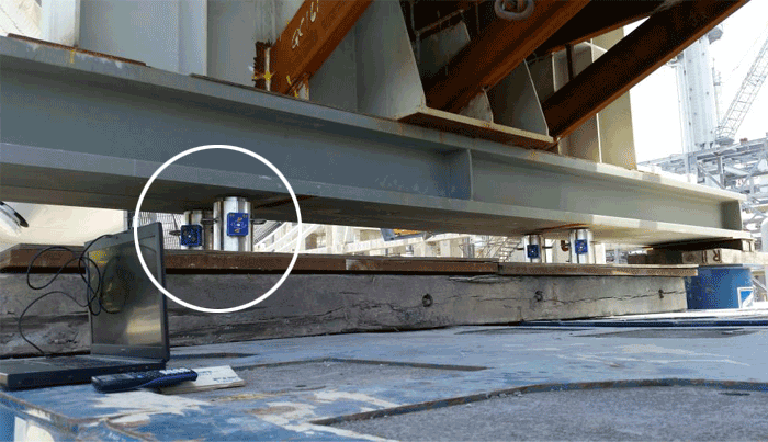 此蒸餾塔直立時高度達87.47米,需要在吊裝作業(yè)前準確獲取其重量和重心這兩項有關(guān)被吊物的關(guān)鍵信息,通過4臺相同負載能力(噸位)的無線壓力傳感單元,我們達到了這一目的。