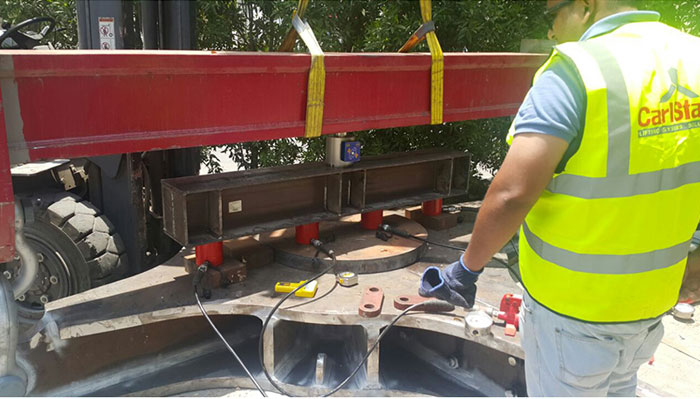 待測(cè)試的夾鉗被平放在地面上,其上放置著四臺(tái)荷載為50噸的液壓缸設(shè)備,沿橫梁方向一字排開。在此橫梁之上,擺放著一臺(tái)規(guī)格為150噸的速得智能壓力傳感單元,其上還有一套更大的吊梁(圖片中的紅色部分)設(shè)備與叉車連接。此大吊梁的左右兩端通過一個(gè)卸扣與夾鉗連接。