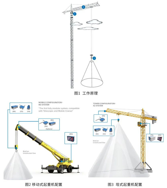 BlokCam是一套可以快速方便安裝在起重機(jī)吊鉤總成上的無線監(jiān)控系統(tǒng),攝像頭下面的聲音和圖像可以實(shí)時(shí)通過無線傳輸?shù)狡鹬刈鳂I(yè)室的屏幕上,可以讓作業(yè)員實(shí)時(shí)看到聽到吊裝周圍的環(huán)境,為有工作盲區(qū)的區(qū)域提供實(shí)時(shí)影像和聲音支持,從而實(shí)現(xiàn)更安全、更高效的起重作業(yè)。 傳感器收集聲音和圖像信息發(fā)送到發(fā)射器,發(fā)射器將接受到的信號(hào)發(fā)射到懸臂,臂架和駕駛室內(nèi)的中繼器。傳感器和發(fā)射器通過電池供電。每個(gè)部件通過磁鐵吸附在滑車側(cè)板或者臂架端邊。中繼器接收到從發(fā)射器發(fā)射的信號(hào),然后中繼到駕駛室內(nèi)的監(jiān)控器。中繼器的位置和配置取決于起重機(jī)的類型,懸臂的類型和懸臂,臂架的長(zhǎng)度。實(shí)時(shí)的聲音和視頻信息發(fā)射并中繼到駕駛室內(nèi)的屏幕上,讓作業(yè)員能夠?qū)崟r(shí)看到聽到攝像頭下面的所有信息。