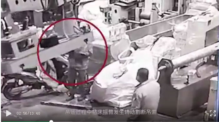 圖片事故案例發(fā)生于2020年,吊運(yùn)過程中鉆床搖臂發(fā)生轉(zhuǎn)動(dòng)割斷吊索,致使紅圈中錢某當(dāng)場被砸死。