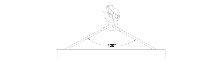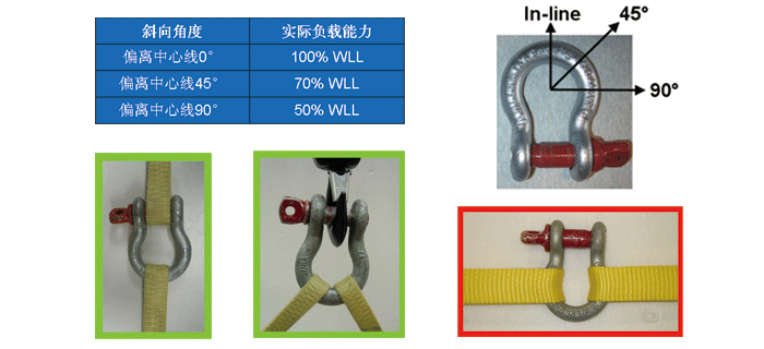 — 卸扣作為主環(huán)使用時,左右兩條分肢必須呈對稱分布,而且兩條分肢之間的夾角最大不得超過120°。